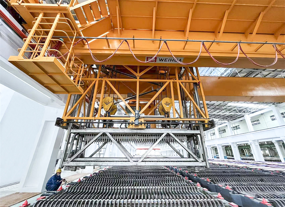 作为该产品最大亮点的铜电解专用吊具,用于阴(始极片)、阳极板的自动出、装槽作业,具有功能多、自动化程度高、绝缘可靠、性能稳定等优势。